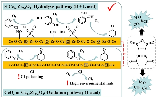 近期,中国科学院城市环境研究所研究员贾宏鹏团队通过锆离子体相掺杂和硫元素表面修饰的方式,在氧化铈催化剂表面依次引入Lewis和Bronsted酸性位点,构建强酸性S-Ce0.7Zr0.3O2催化剂。研究显示,两类酸性位点的引入均可有效提升氧化铈的氯苯降解活性和稳定性。其中,Lewis酸性位点的引入促进晶格氧的活化、提高氧化还原性能,有利于有机物的氧化和吸附氯的氧化脱除。Bronsted酸性位点的存在将氯苯的降解路径由氧化路径转变为水解路径,促进Cl离子以HCl的形式排放,从根本上抑制Cl2的生成,减少含氯副产物和Cl2的选择性(仅1.2%)。由于Lewis和Bronsted酸性位点的协同作用,S-Ce0.7Zr0.3O2展现出优异的催化性能,可在406℃下实现90%的氯苯转化,并在106h的长期测试中维持活性不变。