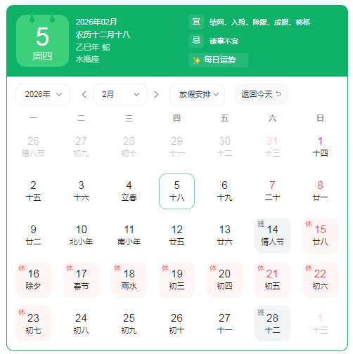 放假时间:2026年2月12日-2月23日放假调休,共12天,24日(正月初八)正式上班。