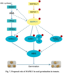 本研究克隆鉴定了番茄种子萌发基因MAPK11,发现该基因正调控ABA合成关键基因NCED1的转录,促进ABA的合成,从而负调控种子的萌发。同时,研究发现MAPK11超表达转基因系的种子萌发对ABA高敏感,磷酸化蛋白组学分析发现MAPK11能影响SnRK2.2的磷酸化,从而调控ABA信号通路,影响番茄的种子萌发。