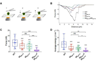 中国科学院水生生物研究所藻类细胞生物学课题组与德国明斯特大学教授Michael Hippler团队合作利用蛋白质组学结合糖组学的方法鉴定出鞭毛膜蛋白发生糖基化的位点以及N-糖基链的组成。研究结果显示在莱茵衣藻三个N-糖基化修饰通路关键酶基因突变体中,鞭毛膜糖蛋白FMG-1B的N-糖基化修饰链结构发生了变化,但是这种异常并未影响蛋白本身在纤毛膜的分布,表明N-糖基化修饰并不影响FMG-1B在鞭毛中的定位。研究人员利用原子力显微镜检测发现,这三株N-糖基化修饰通路突变体的鞭毛粘附力相比野生型均显着下降,尤其是双突突变体(如图1)。此外,还发现当鞭毛内部推动鞭毛滑行运动的反向马达呈抑制状态时鞭毛表面粘附固体基体的粘附力明显增强,说明分子马达给鞭毛滑行运动提供的是反向的推动力,而不是同向的牵引力。