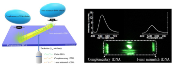 基于上述研究,该团队制备了超长的混合一维光波导晶体,在晶体两端滴下不同的DNA溶液并在晶体中心照射激光,将光波导效率的差异可视化而实现了区分特异性/非特异性序列DNA分子的目的。