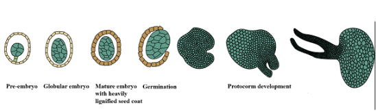 兜兰属(Paphiopedilum)是兰科植物最重要的属之一,其唇瓣特化成兜状或拖鞋状,故又被称为“拖鞋兰”、“仙履兰”等。兜兰属植物以其奇特的花形、丰富绚丽的花色和持久的花期,具有较高观赏价值。尽管我国有丰富的兜兰属植物资源,但大部分种类由于在野生生长环境下繁殖困难,加之过度采挖和生长环境的破坏,已濒临灭绝。兜兰种子细小,且胚发育不完全,无子叶和胚乳(图1),在自然环境中需要与真菌共生才能部分萌发。人工无菌播种虽提供了必要的矿质元素和其他营养物质,大部分兜兰的成熟种子也难以萌发。科研人员在不同胚龄种子的无菌播种实验中发现,发育前期的种子萌发率虽然相对较高,但由于营养物质积累不充分,胚冲破种皮后,发育进程缓慢,成苗率低;成熟后的种子营养物质积累相对充分,能够满足种子萌发后初期的物质与能量需求,萌发后的成苗率较高,但种子萌发率较低。