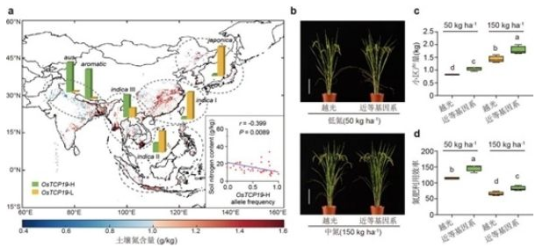 中国科学院遗传与发育生物学研究所储成才研究组对过去100年间收集于全球不同地理区域52个国家(地区)的110份早期水稻农家种进行了全面的农艺性状鉴定,发现不同氮肥条件下,在众多农艺性状中,水稻分蘖(分枝)氮响应能力与氮肥利用效率变异间存在高度关联。研究组利用全基因组关联分析技术鉴定到一个水稻氮高效基因OsTCP19,其作为转录因子调控水稻分蘖。