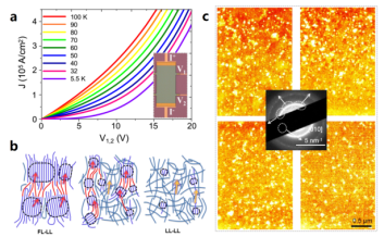 a:导电高聚物Hall bar器件及其非线性IV曲线;b:费米-拉廷格液体异质电阻网络示