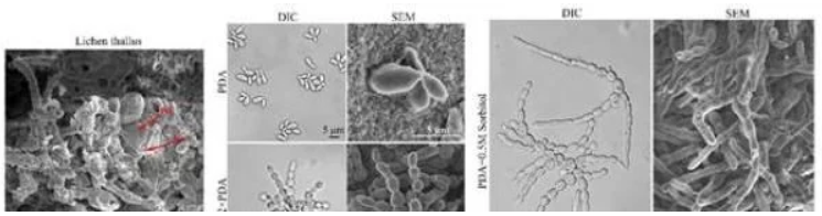 图1. 地衣体内菌丝及藻细胞状态,分离培养酵母态共生菌及诱导条件下假菌丝状态
