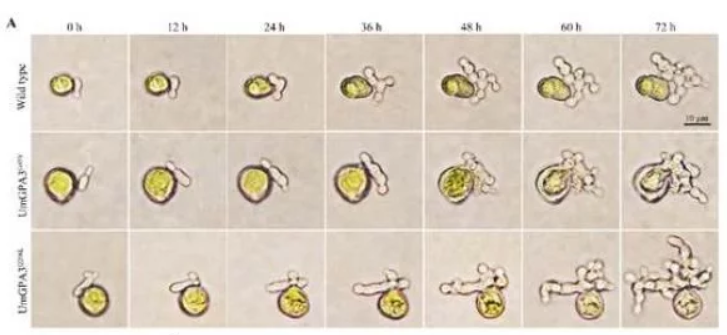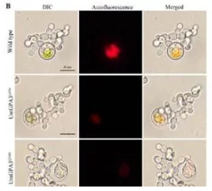 为了进一步验证调控机制,中国科学院微生物研究所等研究人员将该菌编码Gα亚基的Gpa3基因敲除,Gpa3敲除菌株在胁迫及共生藻的诱导条件下均不能产生假菌丝。而在添加IBMX条件下可以恢复产生假菌丝的表型,说明Gpa3基因位于cAMP信号上游并调控cAMP信号通路。显性激活GPA3蛋白(GPA3Q208L)的突变菌株在诱导条件下显示出更多假菌丝分枝,但是在与共生藻接触时不能维持稳定的共生状态,导致30%的藻细胞死亡。结果揭示Gpa3基因及cAMP信号传导在调控共生平衡方面的重要作用。