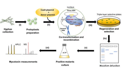 相较于放线菌等原核生物,多核菌基因组更为庞大和复杂、在单一细胞内存在不同的细胞核,普通基因敲除方法难以实现目标基因的彻底敲除,因此目前尚未有高效的基因编辑方法应用于工业多核菌株。针对这一困境,研究人员构建了一种新的双质粒基因编辑系统:含密码子优化后的Cas9质粒和含有目的基因上下游同源臂的同源重组质粒。为了保证敲除效率,在Cas9质粒上引入了抗性基因和多核菌自主复制子。该方法成功实现桔青霉素生物合成基因簇(>15 kb)高效无痕删除。LC-MS检测结果表明,该方法得到的突变株经过10轮培养,仍未检测到桔青霉素,且红曲红色素产量比改造前提高了约5%。