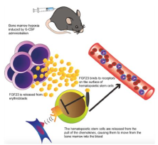 给予G-CSF以及随后对交感神经的刺激,导致骨髓内的氧含量低。很明显,由于这种诱导的缺氧,FGF23从成红血细胞中释放到骨髓内。由于G-CSF的使用,骨髓中释放出令人惊讶的高浓度FGF23(比外周血中的浓度高约20000倍)。随后发现,这种浓度的升高削弱了让HSC保留在骨髓中的锚分子(在这种情况下,指的是趋化因子受体CXCR4),从而导致HSC从骨髓移动到外周血中。