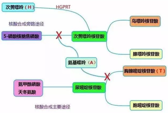 A—氨基蝶呤为叶酸的结构类似物,正是它阻断了核酸合成的主要途径,阻碍了次黄嘌呤核苷酸和胸腺嘧啶核苷酸的合成。H—次黄嘌呤,可经核酸合成旁路途径合成次黄嘌呤核苷酸,从而完成嘌呤核苷酸的补救合成。T—胸腺嘧啶核苷酸,直接添加到培养基中来补足被阻断的嘧啶核苷酸的合成。