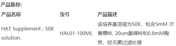 1964年Littlefield首先发明了HAT(H-Hypoxanthine次黄嘌呤,A-Aminopterin氨基蝶呤,T--Thymidine 胸腺嘧啶核苷)培养基的选择培养。