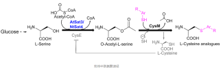 该系统是基于大肠杆菌中半胱氨酸的生物合成途径,通过“劫持”半胱氨酸合成酶(CysM酶)来实现的,该酶以乙酰基丝氨酸和硫氢根离子为底物,催化生成半胱氨酸。CysM酶具有底物识别广泛的特点,除了识别硫氢根离子以外,还可以高效识别不同结构的芳香巯基或硒基的前体小分子。刘涛课题组通过人为添加近50种前体分子,在大肠杆菌内生成这些结构的半胱氨酸类似物。为了进一步优化生物合成途径,提高非天然氨基酸产量,通过表达不受半胱氨酸反馈抑制的上游关键酶O-乙酰丝氨酸转移酶基因AtSat3或NtSat4,进一步提高非天然氨基酸产量。随后以绿色荧光蛋白表征了插入生物合成非天然氨基酸的效率。并且以小分子4-叠氮基苯硫酚(22)为例首次建立了一套基于前体小分子筛选氨基酸的氨酰-tRNA合成酶策略,可进一步提高插入效率。
