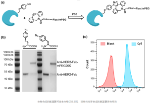 该策略可应用到其他许多的模式蛋白,在开发蛋白质药物、疫苗、荧光、红外或核磁共振探针、金属结合剂以及扩展编码蛋白质中氨基酸侧链的化学空间等方面都有潜在的用途。例如,文章介绍的两个含有生物合成的非天然氨基酸 S-(4-azidophenyl)-L-cysteine和S-(4-acetylphenyl)-L-cysteine的抗体片段Fab,可通过发生生物正交反应偶联荧光以及PEG分子。他们的反应活性与其相应的可用于目前蛋白药物(IL2-PEGylation和HER2抗体药物)开发的非天然氨基酸p-azido-L-phenylalanine和p-acetyl-L-phenylalanine活性相当。
