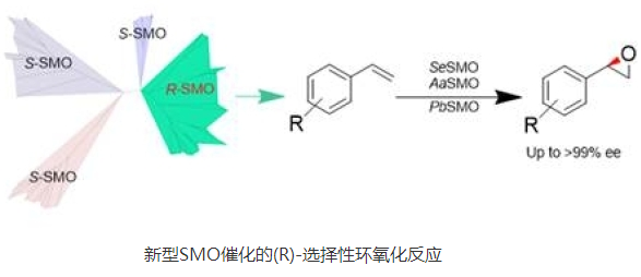 中国科学院成都生物研究所研究员吴中柳研究团队在新酶挖掘中发现并报道了第一个(R)-选择性的SMO(StStyA),该酶是一种来源于链霉菌(Streptomyces sp. NRRL S-31)基因组的黄素单加氧酶,与已知SMO的蛋白质序列相似度低于35%,能够催化苯乙烯及其类似物获得(R)-环氧化产物,ee值91% ~ >99%。进一步数据挖掘发现了一个新的(R)-SMO独特分支,包括8个具有活性的新型(R)-SMOs,科研人员对其中的三个酶:SeStyA(来源于Streptomyces exfoliatus)、AaStyA(来源于Amycolatopsis albispora)和PbStyA (来源于Pseudonocardiaceae)开展了系统研究。研究发现,它们能够催化苯乙烯及其类似物转化为相应(R)-环氧化合物,对大多数底物具有良好的立体选择性,ee值最高达到99%以上。此外,研究还发现AaStyA酶的Phe46残基是一个关键残基,对立体选择性起重要作用。(R)-选择性SMO的发现是单加氧酶研究领域的突破性成果,为(R)-环氧苯乙烯和类似物的生物合成提供了新方法,并为黄素单加氧酶立体选择性机制等研究提供了新线索。