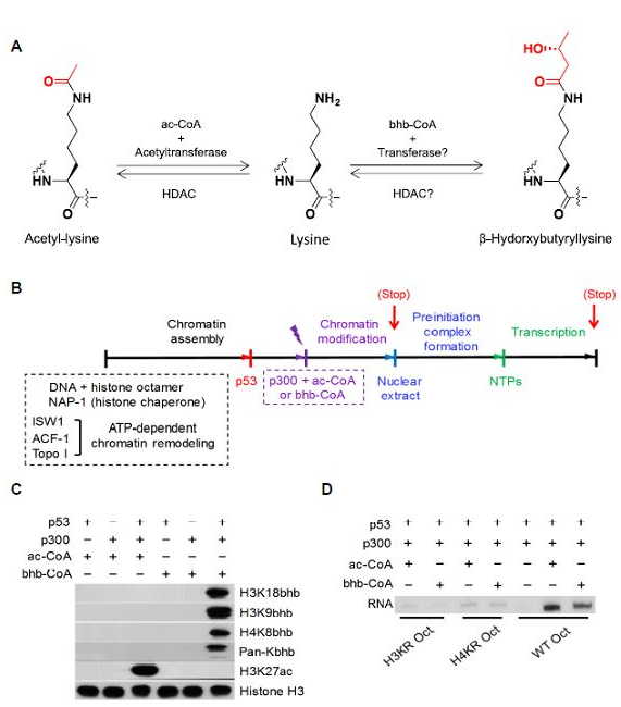 细胞代谢为生命过程提供能量,同时代谢物可通过与蛋白质发生共价结合来发挥信号传导功能。虽然许多代谢物在代谢通路中的作用广为人知,但其介导细胞信号调控的功能仍有待探索。酮体(包括丙酮,乙酰乙酸和β-羟基丁酸)为脂质代谢产物,在葡萄糖缺乏的状态下,肝脏产生的β-羟基丁酸可以用作多种组织的替代能源,越来越多的证据表明,β-羟基丁酸还具有供能之外的作用。赵英明团队早先的研究证实,β-羟基丁酸可作为一种新 型组蛋白翻译后修饰Kbhb的前体,介导转录调控,但其关键的调控酶及底物谱尚不明确。