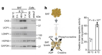 为了进一步研究CKB表达在脂肪细胞中的生理调节作用,研究人员让小鼠分别暴露在寒冷环境(6℃)和高温环境(30℃)中,结果发现在冷暴露的棕色脂肪组织中,CKB mRNA 的水平显着增加,说明CKB参加棕色脂肪细胞的产热过程。