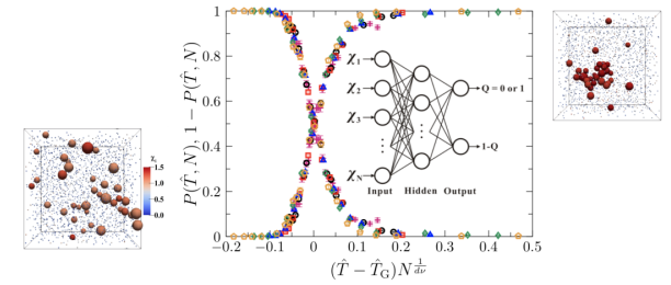 中国科学院理论物理研究所副研究员金瑜亮、北京航空航天大学化学学院研究员蒋滢和加拿大滑铁卢大学教授陈征宇等合作,采用机器学习方法,直接从分子模拟数据出发,研究玻璃模型中的一种特有的复杂非平衡相变——Gardner相变,即在降温条件下,玻璃体系呈现出由具有单一cage size的Glass相到多级次cage size的Gardner相的动力学转变。基于深度学习算法的特征结构识别功能,通过构造基于分子动力学轨迹的输入数据、并结合“有限时间-有限尺寸”效应分析,研究发现机器学习算法不但可以识别这种非平衡相变,而且可以体现体系的空间关联性,从而精确确定该相变对应的临界指标等物理性质(图2)。这也是首次基于分子模拟数据对Gardner相变临界指标的数值报道。该研究方法无需对体系事先构建物理模型,而是直接从轨迹数据出发,由机器学习算法自动提取体系的非平衡态物理规律,从而有效避免了因人为理解的偏差而导致物理模型的失真。因此,该研究非平衡态相变的思路和方法有望在自旋玻璃、高分子聚合物、生物细胞等非平衡态体系中得到进一步应用。相关研究成果发表在PNAS上。博士李华平(北航博士后,现在中国科学院大学温州研究院工作)和金瑜亮为论文的共同第一作者,金瑜亮和蒋滢为论文的共同通讯作者。