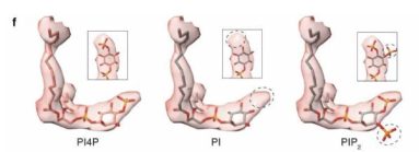 研究人员发现,除了结合的PtdIns4P外,5-HT1A在膜界面被一组广泛的脂质分子包围,包括10个胆固醇分子和3个来自磷脂的酰基尾。这些脂质分子在冷冻电镜密度图中有很好的定义。值得注意的是,PtdIns4P的两个酰基链中的一个夹在两个胆固醇分子之间,这表明胆固醇在稳定PtdIns4P的结合中起作用。这些观察结果表明胆固醇直接参与PtdIns4P的结合,因此为长期观察到5-HT1A信号由胆固醇和磷脂酶调节提供了结构基础。