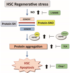研究发现,增殖压力下造血干细胞中NO及整体蛋白巯基亚硝基化修饰SNO的水平明显升高,同时伴随着大量蛋白聚集的累积,该结果提示NO及SNO对增殖压力下造血干细胞具有一定的调控作用。研究利用调控蛋白质巯基去亚硝基化关键酶GSNOR敲除的小鼠进一步发现,敲除GSNOR对于稳态情况下的造血系统表型没有显著影响。然而,在增殖压力下,敲除GSNOR的小鼠HSC造血重建能力下降,自我更新能力减弱。研究通过亚硝基化修饰蛋白组学联用质谱、流式细胞术等方法,发现敲除GSNOR的HSC中NO及整体SNO水平明显升高,同时细胞聚集体的累积及细胞凋亡显著增加。为了证明过度激活的NO信号通路诱导GSNOR敲除小鼠HSC重构缺陷的假设,研究用NO的抑制剂L-NAME处理,发现GSNOR敲除小鼠的造血重建能力及自我更新能力均明显增强。同时,给予帮助蛋白折叠的分子伴侣TCA处理及在GSNOR敲除小鼠中同时敲除诱导凋亡的Chop基因,均能明显改善GSNOR敲除小鼠的造血重建能力。