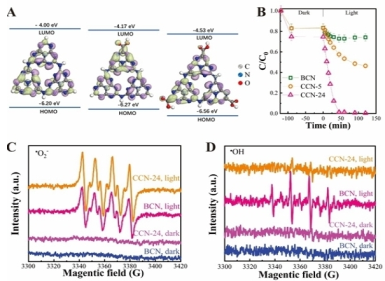 羧基氮化碳分子轨道能量和结构(A),含10 mM HCO3-体系中羧基化氮化碳对U(VI)光催化还原效果(B),BCN与CCN体系产生自由基对比(C、D)