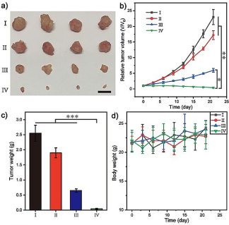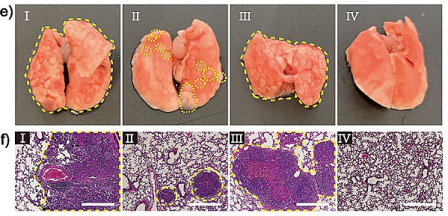该纳米粒子在细胞内展现了优异的催化活性,有效地将无毒的前体分子转化为抗肿瘤药物,原位杀伤肿瘤细胞。并且经纳米粒子处理后,细胞的EGR-1表达水平明显降低,进一步研究发现EGR-1表达降低的肿瘤细胞,其侵袭转移能力也被严重削弱。作者进一步考察了所建立的联合治疗策略在裸鼠肿瘤模型中的抗肿瘤和抗转移效果。在治疗21天后,裸鼠的肿瘤大小明显减小,体重几乎没有发生变化,该纳米粒子展现出良好的抗肿瘤效果和生物相容性。并且,与对照组明显的肺转移相比,实验组显著地遏制了转移。