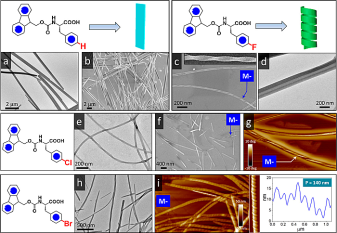 作者以对苯环上具有卤素取代(F、Cl和Br)的N-封端芳香氨基酸(9-芴甲氧羰基(Fmoc)保护苯丙氨酸(F))为模型单元,通过形貌分析(SEM、TEM和AFM)、X射线粉末衍射(XRD)、掠入射角X射线衍射(GIXS)、单晶分析以及结合理论计算系统研究了卤素(F、Cl和Br)对超分子手性自组装体系中的多种作用。