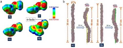 图2. 不同物质的静电电位图(a),FCl和FBr的分子动力学模拟(b)。