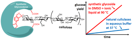 木质纤维素生物质是地球上最主要的可再生资源,每年产生规模高达1700-2000亿吨。若可以开发高效的木质纤维素生物质降解转化途径,将有望解决人类日益严重的能源危机并极大地促进国民经济可持续发展。纤维素占木质纤维素的35%-50%,是最具代表性的一类生物质资源。将纤维素解聚为可溶性单体糖和低聚糖是实现纤维素资源利用转化的第一步,但由于纤维素纤维本身结构特点造成纤维素水解往往需要较高的温度和复杂的溶剂,即使使用天然的纤维素酶催化水解,也面临着酶结构不稳定易失活的问题。开发低能耗且条件温和的多兼容催化剂,不仅有望克服纤维素溶解度差的自身特性,而且能避免苛刻条件下产物去官能团化造成的应用价值降低,是突破纤维素高效转化与可持续利用的有效途径。