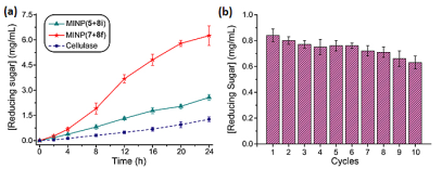 图3.(a)两类分子印迹人工糖苷酶和天然糖苷酶cellulase催化水解纤维素比较;(b)分子印迹人工糖苷酶负载的磁性纳米粒子催化剂的回收循环再利用。图片来源:J. Am. Chem. Soc.