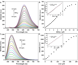 图3. 探针PBC1对 HClO和SO2响应的荧光光谱。图片来源:Anal. Chem.