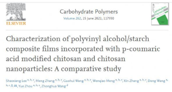 近日,环境学院李少香教授团队在前期研究工作的基础上开发了多种壳聚糖基抗菌、抗氧化材料并构建了相应的具有生物相容性食品包装膜,相关成果以“Characterization of polyvinyl alcohol/starch composite films incorporatedwith p-coumaric acid modified chitosan and chitosan nanoparticles: A comparative study”为题发表在国际知名期刊Carbohydrate Polymers(中科院一区TOP期刊,IF=7.182)上。