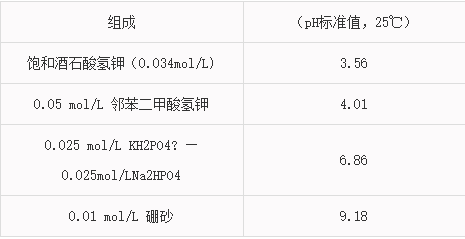 4.6 氢氧化钙标准缓冲溶液:于25℃,用无二氧化碳的水制备氢氧化钙的饱和溶液.氢氧化钙溶液的浓度c[1/2Ca(OH)2]应在0.0400~0.0412mol/L.存放时应防止空气中二氧化硫进入.一旦出现混浊时,应弃去重配. 上述标准缓冲溶液必须用pH基准试剂配制.不同温度时各标准缓冲溶液的pH值列入下表.