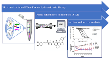 该团队将DNA编码化合物库技术引入酚酸类中药活性成分的结构修饰,合成了含有32000个化合物的DNA编码酚酸衍生物库。采用固定化AT1R对合成的DNA编码酚酸衍生物库进行靶向活性成分筛选,发现了7个富集指数高于20的活性成分。经体外和体内药效学评价,获得了具有显著降压活性的化合物hit 1(图1)。