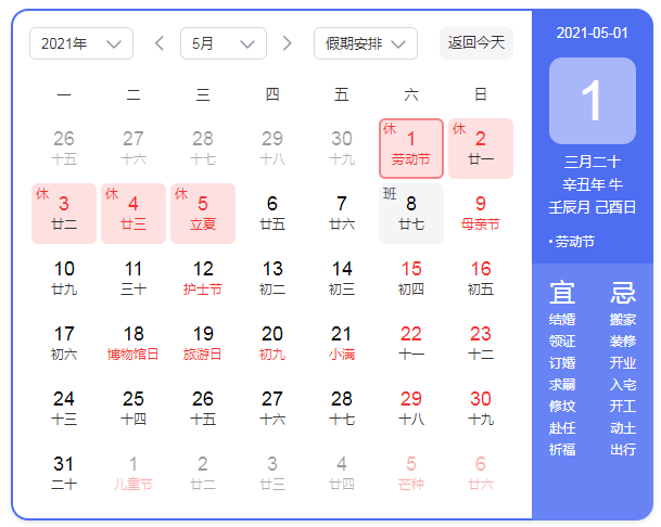 放假时间:2021年5月1日-5月5日放假调休,共5天;5月6日(周四)正常上班,5月8日(周六)调休上班。