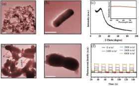 图1.样品表征。(a)碘参杂水热碳透射电镜;(b)PAH 改性后细胞形貌;(c)碘参杂水热碳的x射线衍射和紫外可见光吸收图谱;(d)、(e)碘参杂水热碳和大肠杆菌自组装体系投射电镜;(f)不同光电流下碘参杂水热碳光电流响应。