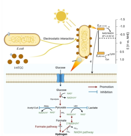 图2.驱动碘参杂水热碳和大肠杆菌自组装体系产氢的机理。