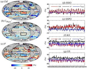 图1.全球中尺度涡致海表浮游植物叶绿素(Chl)、生物量(CPhyto)和碳与叶绿素之比(θ = CPhyto/Chl)的扰动分布。扰动量由反气旋涡与气旋涡内变量之差除以背景均值得到。右图展示的为副热带流涡区的南印度洋(SSIO)和南太平洋(SSPO),以及中纬度黑潮延伸体(KE)和湾流(GS)(左图黑色方框)海域各变量的时间变化特征。左图中灰色细点标注的为扰动不显著的区域