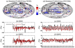 图2.光驯化模型模拟得到的全球中尺度涡致浮游植物碳与叶绿素之比(θ = CPhyto/Chl)的扰动分布。左图模型所用混合层深度(MLD)由全球现场观测的温盐剖面数据计算所得,右图所用混合层深度数据来源于HYCOM模型的再分析资料。下图展示的为副热带南印度洋(SSIO)和南太平洋(SSPO)光驯化模型与卫星观测结果(图1)的对比