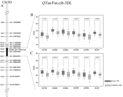 中国科学院成都生物研究所作物分子育种项目组副研究员龙海团队与四川农业大学小麦研究所合作,利用小麦55K SNP芯片对构建的川麦42(CM42)/科成麦1号(K1)双单倍体(Double haploid)群体进行分型,构建了高密度遗传图谱。基于3年2点5个环境的表型数据,研究人员在小麦3D染色体长臂上鉴定到一个新的小穗数主效QTL位点QTsn/Fsn.cib-3D。效应分析结果显示,该位点显著增加每穗粒数的同时,对千粒重,穗长和株高没有显著影响。通过进一步开发与之紧密连锁的竞争性等位基因特异性PCR(KASP)标记KASP_AX-110914105,在不同的遗传背景中验证了该位点的遗传效应。同时,基于小麦基因组注释、同源序列分析和基因克隆测序,研究人员初步推测了该位点的候选基因。该研究为后续该位点的育种应用、精细定位和克隆提供了理论基础。