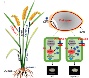 已有研究表明,OsPHO1;2能够介导苗期根-茎组织之间的磷转运。然而,尚无直接证据表明PHO1型蛋白是磷转运蛋白。该研究运用膜片钳系统首次证明OsPHO1;2具有磷转运活性,发现该蛋白同时具有内流活性(influx)和外排活性(efflux),且以外排活性为主。核磁共振波谱分析表明OsPHO1;2不参与细胞内胞质和液泡之间的无机磷(Pi)移动。在灌浆过程中,Ospho1;2突变体籽粒尤其是胚乳细胞中的Pi含量显著累积,而总磷含量降低。说明OsPHO1;2作为一个外运蛋白能够将将Pi从胚乳细胞中释放出来,其突变导致Pi在种子中过量累积,同时破坏了籽粒中母体组织和子体组织间Pi的交换,干扰了有机磷的合成过程。