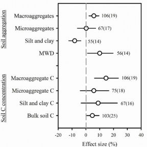 中国科学院华南植物园生态中心博士侯恩庆在研究员旷远文的指导下,联合南京大学科研人员,分析了中国陆地生态系统76个N添加实验数据,评估了N富集对土壤团聚体及其碳固存的影响。研究表明,N素富集显著增大了土壤颗粒的平均重量直径(+10%),提高了大团聚体比例(+6%),但降低了黏粉粒比例(-9%)。在研究的生态系统中,大团聚体碳含量对N素富集响应(+15%)均大于非根际土壤碳含量(+5%),但微团聚体和黏粉粒碳含量对N富集的响应不显著,且N富集对土壤团聚体效应值大小因生态系统类型和施肥策略而异。此外,N富集导致的土壤pH值持续下降与土壤团聚体碳含量密切相关。N素富集通过提高大团聚体碳含量、酸化土壤和抑制微生物对土壤有机质分解途径促进颗粒有机碳的积累。研究推论,大气N沉降可促进中国陆地生态系统土壤团聚体的形成及其固碳效应。