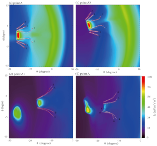 中国科学院院士、国家空间科学中心空间天气学国家重点实验室研究员王赤团队的研究员孙天然等人基于全球MHD模型模拟得到了X射线成像图,通过对极尖区相关区域进行分析得出如下结论:三维极尖区边界的切线方向可以由X射线成像图上辐射强度的局域标准差突增点获得(反演得到的边界切线方向如图2所示);由于缺少X射线信号沿着视线方向的分布信息,在无任何假设的情况下提取出三维极尖区中心线存在困难。在行星际磁场By为0或取较小值的特殊情况下,极尖区中心线位于午夜子午线平面上,则可通过X射线成像结果重构出极尖区中心线的位置,X射线强度的峰值点与三维极尖区中心的切线方向相对应(图3)。基于MHD模型,在不同的视线角度和太阳风条件对X射线图像进行分析,研究揭示出极尖区在不同太阳风条件下的大尺度位形变化特征。