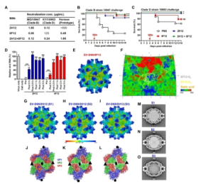 单抗2H12、8F12及其组合的中和谱差异。(B-C)单抗对感染EV-D68 B型和D型临床株的小鼠的治疗功效。(D)病毒吸附细胞前和吸附后的抗体抑制实验,提示单抗主要在吸附前阶段发挥作用。(E)EV-D68/8F12复合物的冷冻电镜密度图。(F)二维投影说明8F12在病毒表面上的“足印”,与唾液酸受体的结合位点有重叠。(G-I)EV-D68/2H12的冷冻电镜结构,包括三种不同状态(即S1、S2和S3),说明2H12可以诱导病毒变构。(J-L)EV-D68/2H12三种状态病毒衣壳的二次轴区域的结构差异,显示S2和S3二次轴孔洞被打开。(M-O)EV-D68/2H12三种状态密度图的中央切片,显示S3所含病毒RNA量显著降低,提示抗体2H12可以诱导病毒提前脱衣壳。