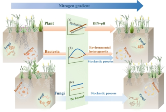 植物与土壤微生物群落相互关联、互相影响。环境变化将可能改变长期演化形成的植物-微生物群落结构,从而对生态系统多样性及功能产生深远影响。以氮沉降为例,氮沉降上升严重威胁陆地生态系统的生物多样性。已有研究表明,氮沉降造成植物和微生物物种丧失(α多样性的下降),群落结构(β多样性)发生改变。然而,学界尚不清楚氮沉降如何影响植物和微生物群落的β多样性,以及植物和微生物响应氮沉降的群落构建机制。
