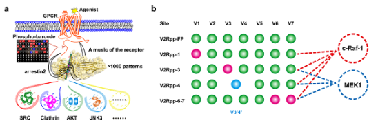 研究团队利用X-ray晶体学解析了4种不同磷酸化模式的V2R C末端短肽与arrestin的复合物结构,直接说明了不同磷酸化短肽与arrestin2形成不同的作用模式。研究还发现了笛子模型中的新磷酸化编码方式,在arrestin上发现了新的磷酸根结合位点“V3'4'”。结果说明,Arrestin与受体磷酸化编码的结合方式可能比想象中复杂,存在磷酸化位点结合的优先次序,某些位置的磷酸化位点结合会决定其他位置是否可以结合,并可能有未发现的新的磷酸化编码结合位点。同时,团队应用新发展的DeSiPher技术【Nature Communications 11, 4857 (2020)】发现GPCR单个磷酸化位点缺陷可诱导arrestin与MEK和c-Raf-1相互作用区域产生特异的动态构象变化,这说明GPCR单个的磷酸化位点缺陷可直接影响arrestin远端功能结构域的构型。另外,团队利用FlAsH-BRET检测了V2R C末端不同磷酸化修饰位点突变引起的受体磷酸化模式差异可不同程度影响arrestin对MEK、c-Raf-1的招募能力。因此,GPCR磷酸化引起激活态arrestin的构型差异可引起arrestin不同的信号传导,调控arrestin发挥功能。
