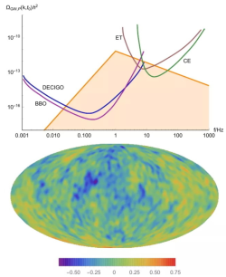 与CMB类似,暴胀结束后产生的引力波在传播过程中振幅相互叠加,形成方向随机的引力波背景(SGWB),其各向异性中也蕴含着暴胀模型的关键信息。在早期宇宙的一些剧烈过程中,如相变、预加热、拓扑缺陷的产生和演化,哈勃视界内往往存在能量密度大的涨落,由于其横向无迹分量非零,这些扰动将产生可观测的引力波。引力波在宇宙中传播时几乎不与其他物质相互作用,能量几乎不衰减,这使引力波成为直接探测早期宇宙演化的理想探针,并将对新物理提供独特的线索。这些随机引力波的频率可以落在多种探测器的敏感区间中,如地基引力波探测器LIGO、空间引力波探测器LISA和Taiji、脉冲星测时阵列SKA等。此外,SGWB也可以解释北美纳赫兹引力波纳米天文台(NANOGrav)合作组发现的随机共谱过程。