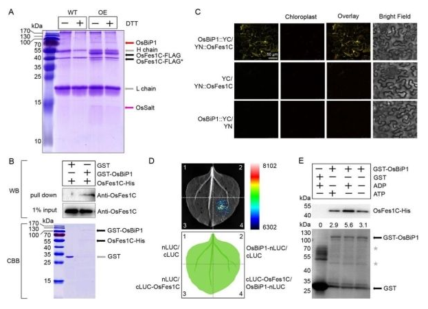 中国科学院植物研究所曲乐庆研究组在对内质网胁迫的水稻种子进行蛋白质组学分析时,鉴定到一个表达水平极显着上调的蛋白OsFes1C。该蛋白与酵母和哺乳动物中的Fes1p同源,但与Fes1p定位于细胞质、响应热胁迫不同,OsFes1C为内质网膜蛋白,表达受内质网胁迫和盐胁迫诱导。进一步研究发现,OsFes1C可以直接与OsBiP1相互作用。添加ADP可以增强OsFes1C与OsBiP1的相互作用,而添加ATP则减弱其相互作用。上述结果表明,OsFes1C是OsBiP1的核苷酸交换因子。过量表达或抑制表达OsFes1C水稻植株对内质网胁迫更敏感,且生长发育受抑制。该研究揭示出OsFes1C调控OsBiP1的分子机理,深化了对水稻内质网胁迫应答机制的理解。